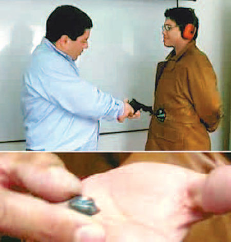 방탄복을 디자인한 콜롬비아 출신의 한 디자이너가 직접 자신이 만든 가죽 재킷 방탄복을 입고 실험에 임한 것이라고 한다. 38구경 권총으로 불과 50cm도 안되는 거리에서 끔찍하게도(?) 쐈지만 총알만 구부러진 모습에 누리꾼들이 가슴을 쓸어내렸다.