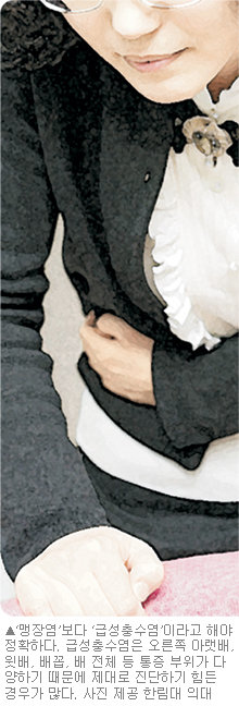《매년 우리나라에서 10만 명이 맹장수술을 한다. 맹장수술이 너무 흔하다 보니 질환으로 생각조차 하지 않는다. 엄밀하게 말해 맹장염은 정확한 질환 명칭이 아니다. 의료계에서는 맹장염이 아니라 급성충수염이라고 부른다. 전성은 한강성심병원 외과 교수는 “맹장에 붙어 있는 충수라는 작은 기관에 염증이 생기는 질환이므로 급성충수염이라고 하는 것이 맞다”고 말했다.》