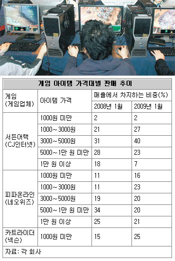 CJ인터넷, 넥슨, 네오위즈게임즈의 ‘간판’ 게임들을 대상으로 지난해 1월과 올 1월의 가격대별 아이템 판매액을 분석한 결과 1만 원 이상의 고가(高價) 아이템 판매 비중은 줄어든 반면 1000원 안팎의 저가 아이템 판매가 크게 증가한 것으로 확인됐다.