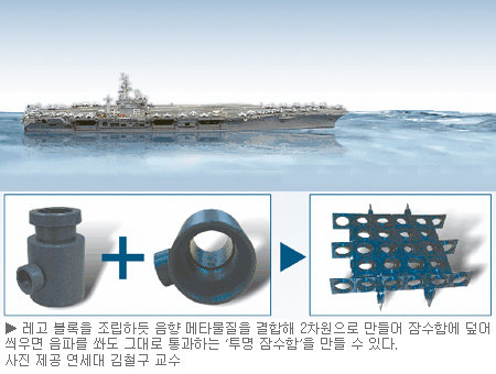 김 교수는 크게 4가지를 꼽았다. 우선 음향 투명망토다. 이 메타물질로 잠수함을 둘러싸면 배에서 바닷속으로 쏜 음파가 잠수함에 부딪힌 뒤 반사되지 않고 그냥 통과한다. 마치 잠수함이 없는 것처럼 보인다. 눈으로 확인할 수 없는 바닷속에서 투명 잠수함은 천하무적이다.