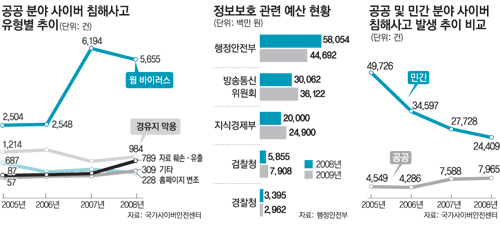 국가기관과 지자체, 산하기관 등 공공 부문에서 발생한 사이버 보안 관련 사고 건수는 2005년 이후 지속적으로 증가하고 있다. 2007년 7588건에서 지난해 7965건으로 5.0% 늘었다. 이에 비해 기업과 대학 등 민간분야의 사이버 보안 관련 사고는 2007년 2만7728건에서 지난해 2만4409건으로 12.0% 감소했다. 2005년 4만9726건에 비하면 3년 만에 절반 수준으로 떨어졌다.