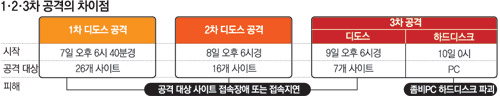 3차 디도스 공격의 핵심은 개인 컴퓨터 하드디스크 파괴였다. 9일 오후 6시경부터는 1, 2차 공격 때처럼 7개 사이트에 접속 장애를 일으켰지만 10일 0시를 기해 이들 사이트를 공격하는 데 이용했던 좀비PC 자체에 해를 가하기 시작했다.