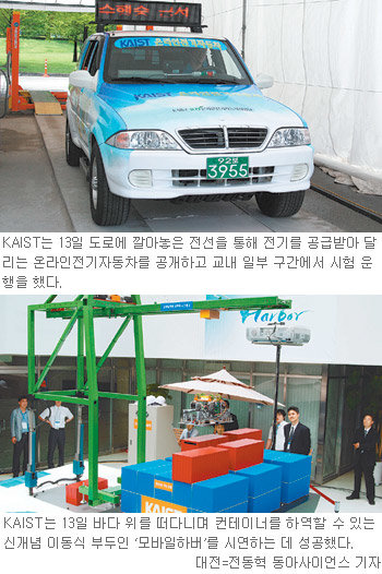 ■ KAIST 융합연구의 두 결실 파도에 꿈쩍않고 배 향해 떠가는 부두 도로를 통해 전기를 충전하는 전기자동차와 화물선을 향해 떠가는 부두…. KAIST가 13일 두 개의 대형 융합 기술을 공개했다. 이날 공개된 온라인전기자동차와 모바일하버는 그동안 KAIST가 미래 먹을거리를 주창하며 올해 시작한 핵심 연구개발 사업이다. 두 프로젝트는 그동안 학계 일부에서 “실효성에 의문이 간다”는 비판을 받아왔다. ○ 기존 전기차 5분의 1 크기 배터리… 상용화 길 터 KAIST는 이날 시연회에서 상용화 가능성을 크게 높인 온라인전기자동차(OLEV)를 공개했다. 별도 충전시설 없이 도로에서 전력을 공급받는 온라인전기자동차는 놀이공원과 관광단지를 중심으로 빠르면 올해부터 운행을 시작할 것으로 보인다. 조동호 사업단장은 “자동차에서 전력을 받는 장치가 도로에서 17cm 떨어진 상태에서 72%의 에너지 효율을 내는 데 성공했다”며 “이는 상용화의 길을 연 것”이라고 말했다. 발전소에서 공급된 전력이 100이라면 72만큼의 에너지가 차를 구동하는 데 쓰인 셈이다. KAIST가 2월 처음 온라인전기자동차를 공개했을 때는 자동차의 전력 수신 장치가 도로와 1cm 간격을 유지해야 해 상용화가 어렵다는 비판을 받았다. KAIST는 온라인전기자동차가 기존 전기자동차의 5분의 1 크기 배터리로도 충분히 운행할 수 있어 사업성이 높다고 주장하고 있다. 일부 학계에서는 온라인전기자동차에 대해 “에너지 효율이 90%를 넘지 않으면 실효성이 없고 도로 아래에 자기장이 발생되는 전력선을 묻는 비용도 무시할 수 없다”고 지적하고 있다. 조 단장은 이에 대해 “서울랜드의 코끼리열차와 제주관광단지의 교통수단 일부가 11월부터 온라인전기자동차 방식으로 바뀔 테니 기대하라”고 말했다. ○ 신기술로 파도제어 성공한 모바일하버 모바일하버는 크레인을 싣고 바다 위를 떠다니며 화물선에서 컨테이너를 내려받아 항구까지 운송하는 ‘움직이는 작은 부두’이다. 모바일하버는 그동안 요동치는 바다에서 컨테이너를 정확히 들어올리고 내리는 것이 어렵다는 비판을 받아왔다. 모바일하버사업단은 이날 인간형 로봇 ‘휴보’를 개발한 오준호 교수팀이 제안한 ‘제로 모멘트 안정화 크레인’이라는 신기술을 소개했다. 이 기술은 크레인이 크게 흔들리기 전에 끊임없는 미세 조정으로 크레인의 중심을 유지하는 기술이다. 오 교수는 “새 크레인은 배가 파도에 흔들려도 수직 상태를 유지할 수 있다”고 말했다. 시연회에서는 파도에 흔들리던 20분의 1 크기의 작은 크레인이 제로 모멘트 시스템을 가동하자 꼿꼿이 선 모습을 보였다. 오 교수는 “20분의 1 축소 모델을 실제 크기로 만들어도 효과는 똑같다”고 주장했다. 학계 일부에서는 축소 모델을 실제 크기로 키우면 결과가 달라질 수 있다고 우려하고 있다. 예상 못한 강풍이 부는 경우도 위험하다. 이에 대해 곽병만 모바일하버사업단장은 “안정화 기술에 대한 논란은 있지만 충분히 극복할 수 있다”며 “다른 대학과의 공동 연구를 통해 2년 안에 상용화하겠다”고 밝혔다. 대전=전동혁 동아사이언스 기자 jermes@donga.com