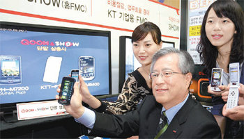 KT는 14일 서울 종로구 세종로 KT아트홀에서 기자간담회를 열고 휴대전화와 인터넷전화를 한 개의 단말기로 이용할 수 있는 유무선통합(FMC) 서비스인 '쿡&쇼'를 20일부터 시작한다고 밝혔다. 평소에는 3세대(3G) 이동통신(WCDMA)망을 이용해 통화하다가 무선랜이 설치된 지역에서는 인터넷전화로 바꿔서 사용할 수 있다. 또 KT의 네스팟존에서는 공짜로 무선인터넷을 즐길 수 있다. 이석채 KT 회장은 "쿡&쇼 출시로 KT가 합병을 통해 제시한 컨버전스(융합)라는 새로운 정보기술(IT) 트렌드를 실현했다"고 말했다.