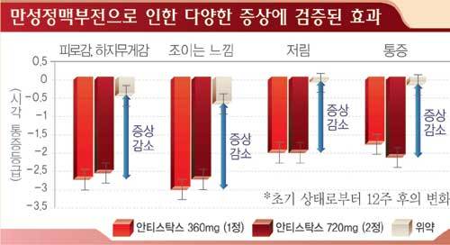 독일 훔볼트 의과대 샤리테병원이 1998년 4월에서 9월까지 성인남녀 262명(남자 30%·여자 70%)을 대상으로 진행한 임상시험 결과에 따르면, 안티스탁스 복용 후 부기와 통증, 다리 피로감 등이 현저하게 떨어진 수치를 보이는 것으로 조사됐다. 혈액의 흐름도 원활해진 것으로 나타났다(그래프 참고).