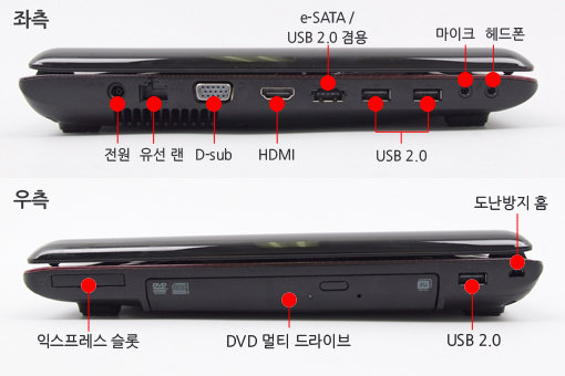 USB 2.0 포트의 경우, 좌측 면에 3개, 우측 면에는 1개가 있다. 이 정도면 USB 포트가 부족할 일은 없을 듯하다. 좌측 면에 있는 3개의 USB 2.0 중 1개는 e-SATA 겸용 포트이다. e-SATA 전송속도의 제한이 있는 USB 2.0 가 달리 SATA 하드디스크의 최대성능을 그대로 사용할 수 있으므로 외장 하드 연결 시 사용하면 유용하다. 다만, 지금 가진 e-SATA 지원 외장 하드가 없어 실제로 성능을 체험해 보진 못했다.