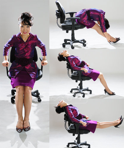 ※ 주의: 상체를 숙일 때 가능한 한 무릎을 굽히지 말고 쭉 편 상태에서 수련해야 효과적이다. 무리하게 하지 말고 개인이 시원한 느낌이 드는 정도로만 한다. 의자 바퀴를 고정하거나 벽에 기대고 하여 상체를 앞으로 숙일 때 의자가 밀려나가지 않도록 주의한다.