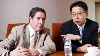 에드워드 키스톤 캐나다류머티스연구협회장(왼쪽)과 송영욱 대한류마티스학회 이사장이 처음부터 강한 약을 집중적으로 사용하는 새로운 류머티즘 치료법에 대해 얘기를 나누고 있다. 사진 제공 대한류마티스학회