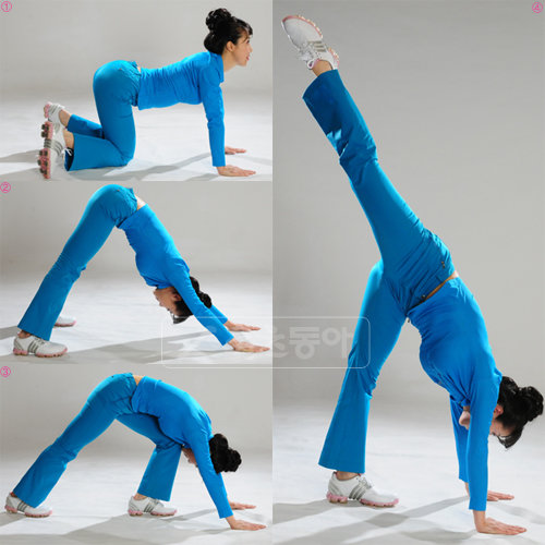 4. 왼다리를 펴면서 오른쪽 다리를 들어올린다. 이때 개인의 유연성에 따라 들어올릴 수 있는 만큼 수련한다. 10초 정지, 좌우
