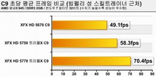 테스트 결과, 역시 점수는 XFX HD 5770 트리플X > XFX HD 5750 트리플X > XFX HD 5670 순으로 높았다. 특히, XFX HD 5770 트리플X는 XFX HD 5670의 2배에 가까울 정도로 높은 점수를 기록할 정도로 상당한 성능 우위를 가진 것으로 나타났다. 하지만 벤치마크 프로그램 점수가 2배라고 해서 게임 성능 역시 정확히 2배가 나오는 것은 아닐 터. 지금부터는 직접 C9을 구동해 보며 실질적인 성능을 체험해 보기로 하자.