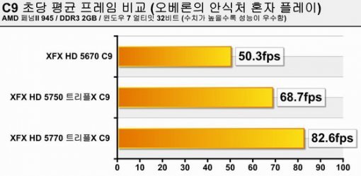 이번에 테스트 해본 XFX의 AMD 라데온 HD 5000 시리즈 C9 에디션 3종, 즉 ‘XFX 라데온 HD 5670’과 ‘XFX 라데온 HD 5750 트리플X’, 그리고 ‘XFX 라데온 HD 5770 트리플X’는 다소의 차이는 있었지만 모두 C9을 플레이하는 데 부족함이 없는 성능을 발휘했다.