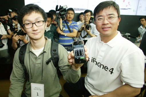 아이폰4 공식 1호 개통자 신현진씨(대학4학년)와 표현명 KT 개인고객부문 사장