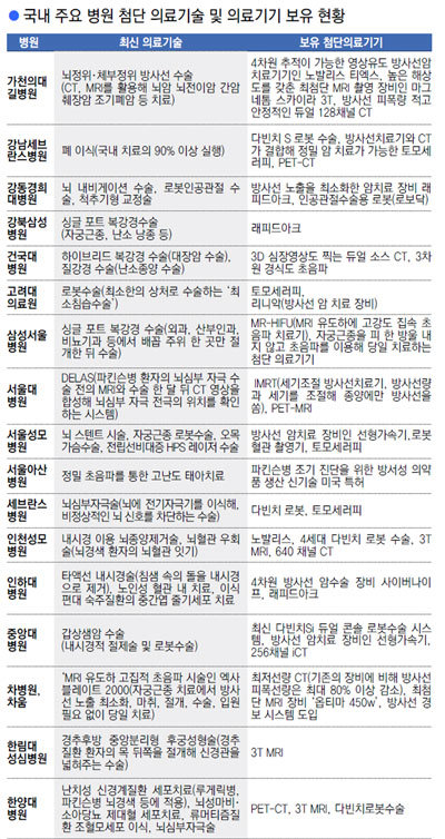 ▽첨단을 달리는 암 치료 =뇌종양, 간암, 췌장암 등 인체 곳곳에 생기는 암 부위만 없애면서 정상세포는 손상을 주지 않는 기기들이 속속 나오고 있다. 대표적인 기기인 노발리스는 종양 부위를 칼로 째지 않고 방사선을 쏘아 한 번에 종양을 태워 없앤다. 인천성모병원, 일산백병원, 분당차병원, 동아대병원, 천안 순천향대병원, 길병원 등에 이 기기가 들어왔다.