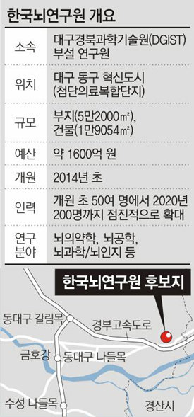 국내 유일의 뇌 연구 국책 연구기관인 ‘한국뇌연구원’이 대구에 설립된다. 뇌연구원은 대구경북과학기술원(DGIST) 부설 연구원으로 지정돼 2014년 초 첨단의료복합단지 안에 5만2000m² 규모로 문을 열 예정이다. 고령화 사회를 대비한 뇌질환 진단 기술과 치료제 개발이 주된 목표다.