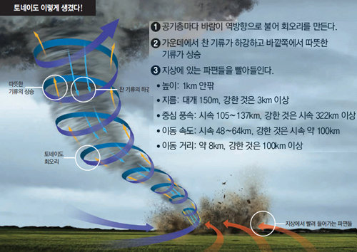 미국의 토네이도는 로키산맥을 건너온 차갑고 건조한 북서풍과 멕시코 만에서 불어오는 따뜻하고 습한 남동풍이 광활한 평원에서 부닥치면서 생겨난다. 두 개의 바람이 만나면 강력한 공기 덩어리가 만들어진다. ‘슈퍼셀’이라고 부르는데, 이것이 토네이도의 씨앗이 된다.