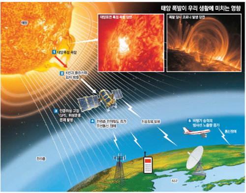 우주 날씨가 우리에게 어떤 영향을 미치겠느냐고 생각하겠지만 우리 삶과 밀접한 관련이 있다. 태양 흑점이 폭발하면 에너지 입자와 X선 등이 우주로 방출되면서 지구 표면에서 100km나 떨어진 전리층까지 도착해 전자밀도를 높인다. 일정한 전자밀도를 유지하고 있는 전리층은 전파를 반사한다. 무선통신은 이런 성질을 이용한다. 그러나 전리층에 있는 전자의 수가 많아지면 전파를 반사하지 않고 흡수한다. 통신 장애가 발생하는 것이다.