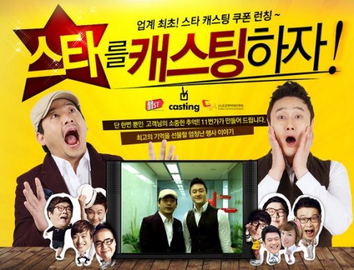 우선 ‘스타 캐스팅 쿠폰’에 참여하는 연예인은 김준호, 김대희, 김원효, 정경미, 김준현, 김지호, 양상국, 이광섭, 유민상, 정명훈, 권재관 등 코코엔터테인먼트 소속 개그맨 11명이다. KBS 개그콘서트에 출연중인 인기 개그맨들이다.
