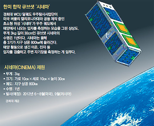 시네마는 올해 모두 3기가 올라간다. 세쌍둥이 위성이 우주공간에서 전방위적으로 자료를 모으는 것이다. UC버클리가 제작한 1기는 6∼8월 델타로켓에 실려 미국에서 발사될 예정이다. 나머지 2기는 경희대 WCU사업단이 제작하고 있다. 경희대가 만드는 2기는 9월 드네프르로켓에 실려 러시아에서 발사된다. 이동훈 WCU사업단장(경희대 우주탐사학과 교수)은 “시네마 3기가 서로 다른 방향에서 우주공간을 입체적으로 찍는 만큼 데이터의 정확도가 높을 것”이라고 밝혔다.