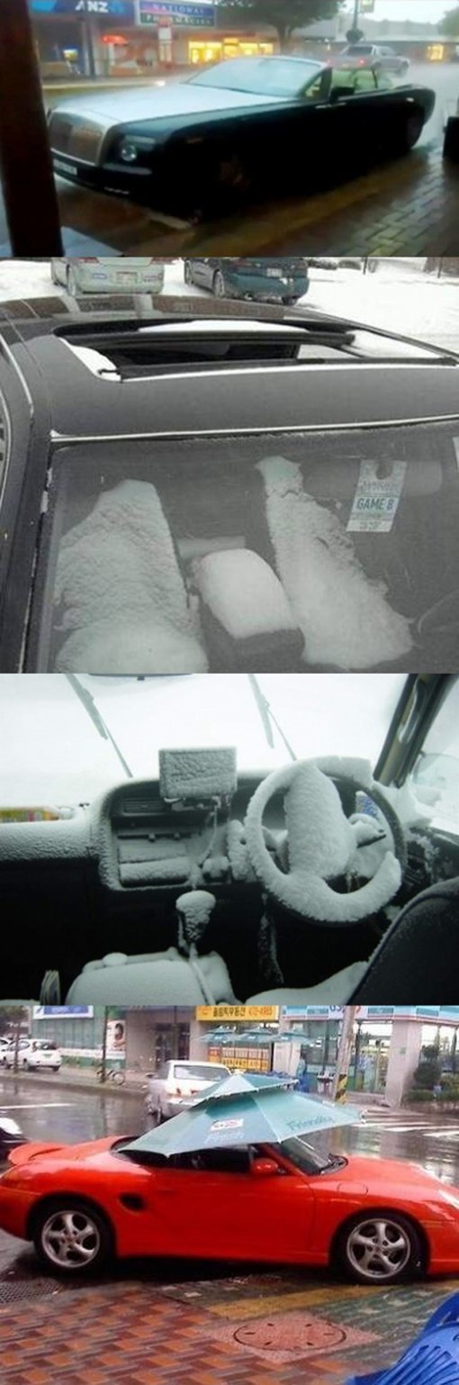첫 번째 사진의 검은색 오픈카는 쏟아지는 비를 그대로 맞고 있는 모습. 이어 선루프가 열린 또 다른 오픈카는 눈을 맞아 차량 안에 눈이 가득 쌓여 있다.