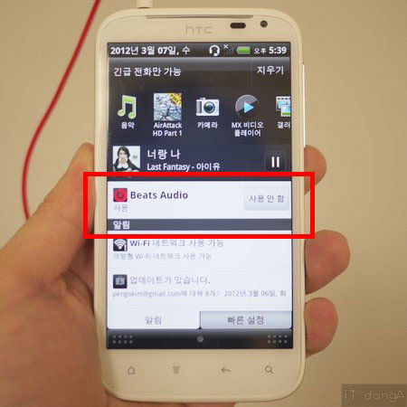 이젠 본격적으로 센세이션 XL의 가장 큰 특징이라는 음악을 즐겨볼 차례다. 기본 제공되는 음악 플레이어와 비츠 오디오 앱을 실행시킨 후 닥터드레 이어폰을 이용, 국내 가요 및 록, 클래식 등 다양한 장르의 음악을 들어보았다. 청취를 해보니 상당히 ‘맛깔 나는’ 소리를 들려준다는 느낌을 받았다. 특히 고음과 저음의 균형이 좋은데, 고음 출력 시에도 소리가 찢어지는 느낌이 없고, 각 악기의 소리가 선명하게 전달된다. 저음 역시 힘이 있으면서도 저가형 음향기기의 저음처럼 둥둥거리는 느낌 없이 묵직하고 섬세한 음향을 들려준다.