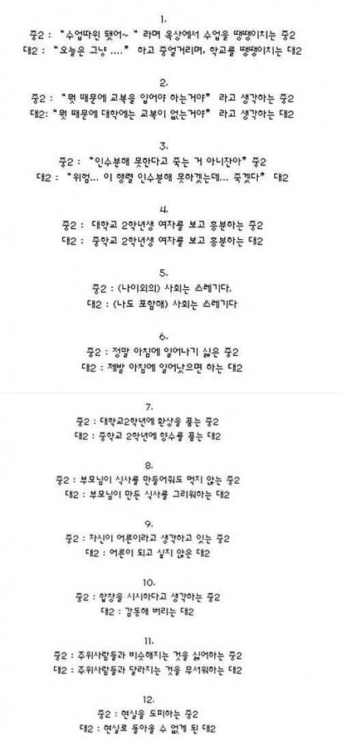 게시물은 같은 상황에 대한 중학교 2학년과 대학교 2학년의 학생들의 생각을 각각 비교해 놓은 것으로 제시된 12가지 상황에 대해 완전히 서로 다른 생각을 하고 있다.