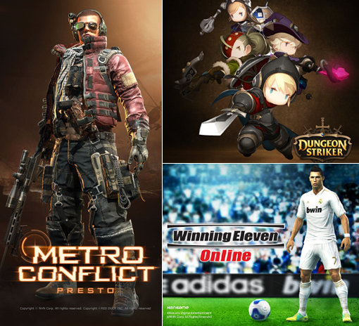 한게임이 다양한 장르의 신작 게임을 공개하며 새로운 도약을 준비하고 있다. (왼쪽부터 시계방향으로) FPS게임 ‘메트로컨플릭트’와 액션RPG ‘던전스트라이커’, 스포츠게임 ‘위닝일레븐온라인’. 이미지제공|NHN 한게임
