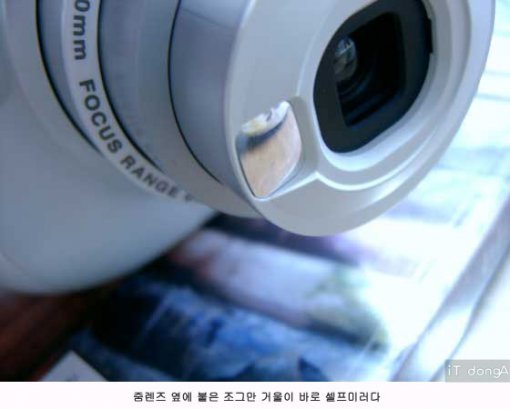 FUJI FILM이라는 로고가 새겨진 전면에는 플래시와 뷰파인더, 셀프미러, 그리고 렌즈가 달려 있다. 셀프미러를 제외하면 일반적인 즉석카메라와 그리 다르지 않다. 셀프미러는 소위 ‘셀프카메라’를 위한 조그만 거울이다. 원래 즉석카메라로 셀프카메라를 찍는 일은 여간 힘든 게 아니다. 특히 두 명 이상을 찍을 때는 더 그렇다. 어림잡아 찍으면 한 명의 얼굴이 잘린 채로 사진이 나오기 십상이기 때문이다. 즉석카메라의 필름 값이 비싼 것을 생각했을 때 아깝기 그지없다. 그래서 나온 것이 셀프미러다. 셀프미러는 카메라 앞에 부착되어 있는데, 미러에 비친 얼굴을 보고 찍을 수가 있어 사진이 잘못 나오는 일이 거의 없다.