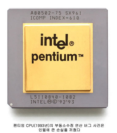 다만, 이런 오락용 프로그램에서 일어나는 버그는 단순히 웃고 넘어가는 해프닝 수준에 그치는 경우가 많은 반면, 일부 프로그램의 버그는 해당기업, 혹은 사회 전반에 큰 피해를 끼치는 경우도 있다. 대표적인 예가 1993년에 인텔에서 출시한 펜티엄(Pentium) CPU(중앙처리장치)의 버그 문제다. 인텔의 야심작이었던 펜티엄 CPU는 출시와 동시에 폭발적인 인기를 끌었으나 출시 1년 후, 부동소수점연산과정에서 오류를 일으킬 수 있다는 것이 확인되었다. 이 때문에 인텔은 버그가 있는 펜티엄 CPU의 전체를 리콜(recall) 해야 했고, 총 4억 달러의 이상의 손해를 봤다.