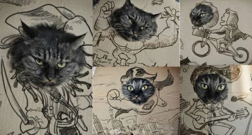 공개된 사진은 종이에 그림을 그리고 얼굴 부분만 오려낸 것. 특히 오려낸 얼굴 부분에 진짜 고양이 머리를 집어 넣어 입체적인 작품을 만들어냈다.