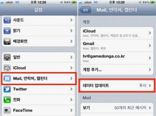 아이폰에 등록한 이메일 계정으로 새로운 메일이 온 것을 확인하는 푸시 기능도 배터리를 빠르게 소모한다. 자주 이메일 확인을 하지 않는다면, 푸시 기능을 끄고 필요할 때마다 수동으로 확인하는 것도 사용 시간을 늘릴 수 있는 방법이다. 푸시 기능은 [설정]-[Mail. 연락처, 캘린더]-[데이터 업데이트c]에서 조절할 수 있다.