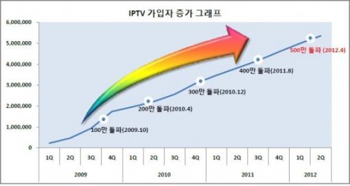 초고속 인터넷망을 이용해 제공되는 양방향 텔레비전 서비스 ‘IPTV’가 상용화 3년4개월 만에 가입자 500만을 돌파했다. 아날로그 케이블은 6년, 위성방송은 300만까지 9년이나 소요됐던 것과 비교하면 괄목할만한 성장이다.