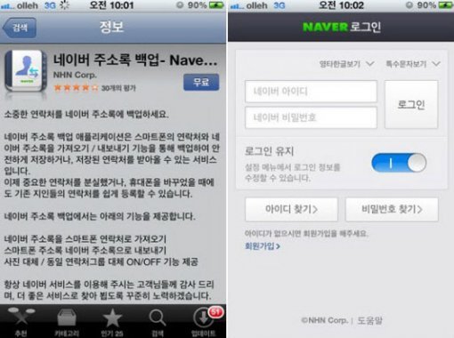 연락처 백업하기 이전에 설명한 아웃룩으로 연락처를 옮기는 방법을 택했다면, 그것 자체로 백업을 한 것이나 다름없다. 다만, 최근 간단하게 연락처를 백업하고 다시 원상복귀도 할 수 있는 유용한 정보가 있어 소개한다. ‘네이버 주소록 백업’이라는 앱을 통해 연락처를 네이버 주소록에 백업하는 방법이다. 무료로 누구나 사용할 수 있다.