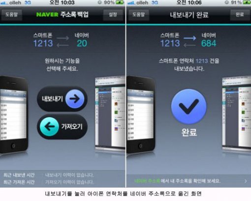 사용 방법은 간단하다. 앱스토어에서 네이버 주소록 백업 앱을 검색해 내려받아 설치하고, 네이버 아이디로 로그인하면 아래 스크린샷처럼 ‘내보내기’와 ‘가져오기’ 두 버튼이 보인다. 여기서 내보내기는 아이폰에 저장한 연락처를 네이버 주소록으로 백업하는 기능이고, 가져오기는 네이버 주소록에 저장한 연락처를 아이폰으로 가져오는 기능이다. 내보내거나 가져올 때 연락처의 사진이나 그룹 등의 정보는 화면 우측 상단에 있는 ‘설정’ 메뉴에서 조절할 수 있다.