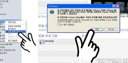 아래 스크린샷처럼 아이튠즈에 아이폰을 연결한 다음 장비 창에서 마우스 우 클릭 후 ‘구입 항목 전송’을 선택하면 그 동안 아이폰에서 사용하던 앱을 아이튠즈로 옮길 수 있다.