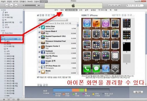 아이튠즈로 옮긴 앱은 아이튠즈 왼쪽 메뉴에서 장비를 선택한 후, ‘응용 프로그램’ 항목을 클릭하면 확인할 수 있다. 참고로 아이튠즈 응용 프로그램 화면에 보이는 아이폰의 화면에서 앱을 정리하고 동기화를 하면, 실제 아이폰에서도 그대로 정리가 된다. 많은 앱을 한꺼번에 정리할 때는 아이튠즈의 이 기능을 통해 하는 것이 편리하다.