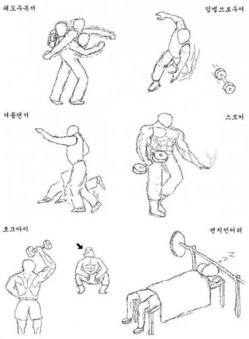 이 네티즌이 말하는 헬스클럽 민폐 유형을 보면 덤벨을 던지는 ‘덤벨쓰로우어’, 한 손에 덤벨을 들고 다른 한 손으로 담배를 피는 ‘스모커’ 그리고 덤벨 운동을 하는 몸 좋은 사람을 매의 눈으로 구경만하는 ‘호크아이’다.