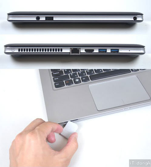 울트라북 치고 약간 무겁고 두꺼운 것 아니냐고 느낄 수 있지만, 외부 연결 인터페이스를 보면 어느 정도 수긍할만하다. 우측면에 마이크/헤드셋 단자, USB 2.0 한 개, 전원 연결 단자가 있고, 좌측면에 통풍구 옆으로 유선랜(RJ-45) 포트, 일반 규격 HDMI, USB 3.0 두 개가 달려 있다. 전면 왼쪽에는 2-in-1 멀티카드 리더기와 전원, 배터리 충전 표시 LED가 있다. D-SUB(VGA) 포트가 없는 것이 약간 아쉽긴 하지만, 그래도 이 정도면 무난한 편이다. 일반 규격 HDMI가 있으니 변환 젠더를 이용하면 되리라.