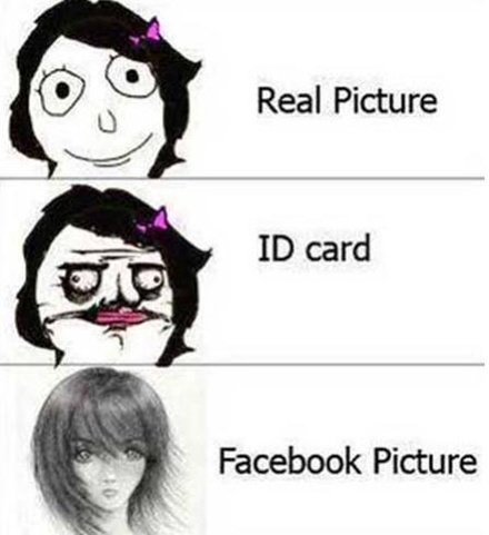 실제로 평범하게 생긴 한 여성의 얼굴이 신분증과 페이스북 프로필에서 어떻게 바뀌는지 나타낸 것이다. 이를 두고 ‘여자들의 얼굴 변화’로 표현한 것이다.