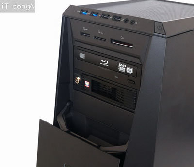전면을 언뜻 보면 아무런 스위치나 장치가 눈에 띄지 않는데, 가운데 부분을 살짝 누르면 덮개가 아래로 내려오며 카드리더 및 ODD(광 디스크 드라이브), 그리고 하드랙(외부로 하드디스크를 꽂는 장치)이 모습을 드러낸다. 특히 하드랙은 별도의 외장 케이스에 하드디스크를 넣어 사용하는 방식이 아니라 일반 3.5인치 SATA 하드디스크를 그대로 꽂아 넣는 식으로 사용하기 때문에 편의성이 높다. ODD 역시 눈에 띄는데, CD와 DVD뿐 아니라 블루레이 디스크까지 지원해 멀티미디어 감상에 강한 면모를 보여주고 있다.