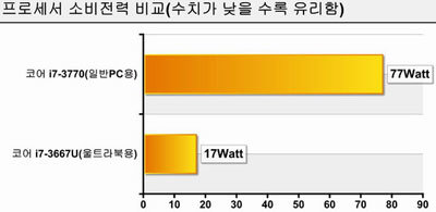 가장 큰 차이점이라면 바로 소비 전력이다. 일반 PC용 프로세서인 코어 i7-3770의 설계전력은 77W에 달하지만 울트라북용 프로세서인 코어 i7-3667U의 설계전력은 17W에 불과하다(울트라북용 CULV 프로세서는 모델명 뒤에 ‘U’가 붙는 것으로 구분이 가능하다). 같은 코어 i7의 브랜드를 달고 있지만 전력 소모량은 4.5배 정도 차이가 나는 것이다.