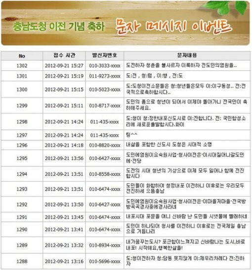 충남도청이 MO 서비스를 이용해 전개하는 이벤트를 예로 들어 보자. 충남도청은 3개월 앞으로 다가온 도청 이전을 기념해 불특정다수를 대상으로 4행시 또는 5행시를 짓는 이벤트를 펼친다. 이 이벤트에 참여하는 사람들은 1666-2276으로 40자 이내의 SMS를 보낸다. 그럼 이벤트 대행을 맡은 넥스티아(Nextia)가 자사의 SMS솔루션인 ‘메시지미’ 서버에 이 SMS를 차곡차곡 저장한다. 그리고 미리 설정한 메시지를 담은 답장이 자동 발송된다. 충남도청은 참여자들의 전화번호, 메시지 내용, 참여 시간을 일목요연하게 받아볼 수 있으며 참여자들은 SMS와 인터넷을 통해 수신 유무를 확인할 수 있다.
