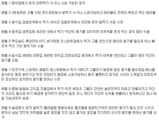 이어 레벨3은 분식집에서 먹는 것으로 특히 야간에는 편의점만큼 쉬운 수준이다. 레벨4는 중국집이나 허름한 식당에서 먹기다. 약간의 용기가 필요하지만 혼자 먹는 손님이 의외로 많다고 한다.