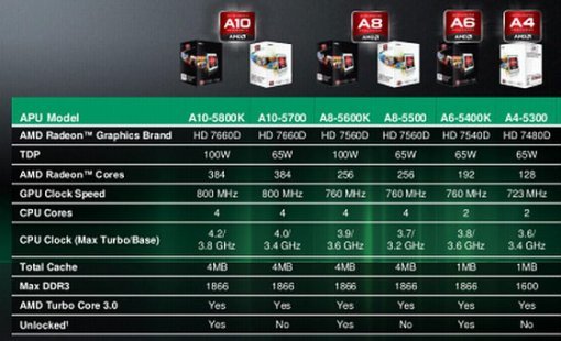 작년에 나온 1세대 AMD APU(코드명 라노)는 보급형인 A4, 중급형인 A6, 그리고 상급형인 A8의 3가지 모델로 구분되었다. 하지만 2세대 제품부터는 최상위급인 A10을 추가했다. A10은 4개의 코어를 가진 쿼드코어 CPU에 라데온 HD 7660D GPU를 포함하고 있다. A8 역시 쿼드코어 CPU를 갖추고 있지만 내장 GPU는 한 등급 아래 제품인 라데온 HD 7560D 이며, A6와 A4는 듀얼코어 CPU에 각각 라데온 HD 7540D와 라데온 HD 7480D GPU를 포함한다.
