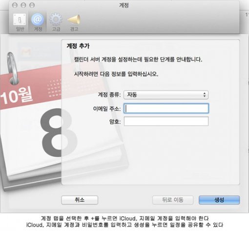 먼저 캘린더에 적어둔 일정을 공유해본다. OS X 바탕화면 하단의 캘린더를 실행한다. 그 다음 화면 상단 캘린더 메뉴의 환경설정에 진입한다. 그리고 계정 탭을 선택한 후 +를 눌러 iCloud 계정 또는 지메일 계정과 비밀번호를입력하면 된다. 입력을 완료하면 일정 공유를 위한 모든 과정이 끝난다.