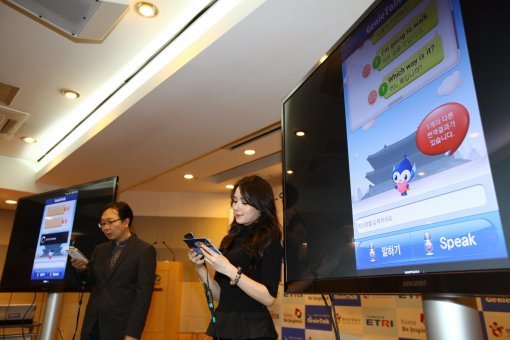 한국전자통신연구원(ETRI)이 개발한 한·영 자동 통역 앱 ‘지니톡’을 시연하고 있다. 최근 ‘지니톡’처럼 음성, 영상, 문자