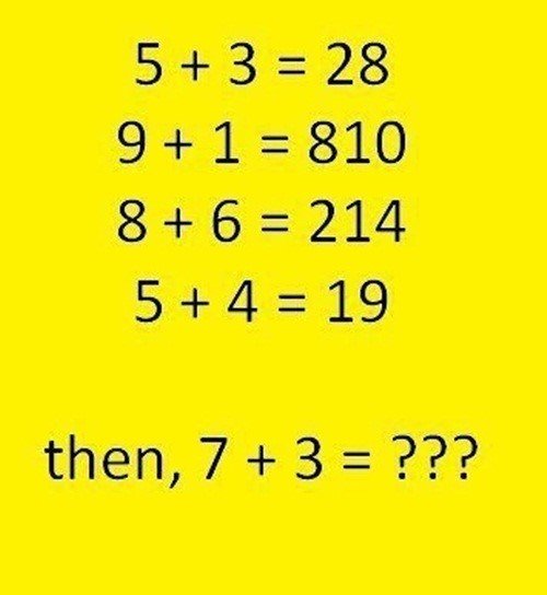 문제는 여러가지 식을 보여준 후 ‘7+3’의 답은 무엇이냐고 묻고 있다. 이 속에 숨어있는 법칙은 앞의 숫자와 뒤의 숫자를 뺀 결과, 앞의 숫자와 뒤의 숫자를 더한 결과를 나열하는 방식이다.