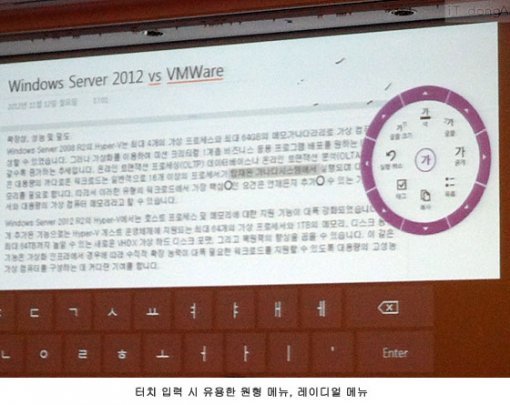 뉴 오피스의 워드2013이나 액셀2013, 파워포인트2013 등의 가장 큰 변화는 윈도8을 토대로 한 터치 입력에 대응하고 있다는 점이다. 손가락이나 펜 터치 사용에 유용한 메뉴나 기능이 화면 이곳 저곳에 담겨 있다. MS 백승주 부장이 시연한 데모에서는 화면 터치 사용 시 편리한 레이디얼 메뉴가 대단히 인상적이었다. 화면 어디서든 돌출되는 원형 메뉴로, 마우스 없이 터치 입력으로도 문서 작업에 불편이 없도록 했다(물론 마우스 사용이 훨씬 편하겠지만).