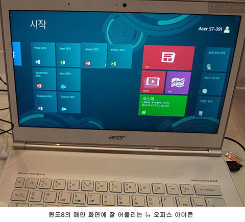 윈도8이 그랬듯 로고도 바뀌었고 전반적으로 깔끔하면서 시원하게 변한 듯하다. 워드2013, 액셀2013, 파워포인트2013 등이 윈도8 메인 화면에 아이콘 형태로 나열되니 실행 경로도 단축된다. 결정적으로 액셀2013의 경우 여러 개의 액셀 문서를 다른 창으로 열 수 있게 개선된 점이 더할 나위 없이 반갑다. 아울러 원노트2013도 에버노트에 뒤지지 않을 수준의 신속성과 유연함을 보여주어 에버노트와 좋은 경쟁이 될 듯하다.