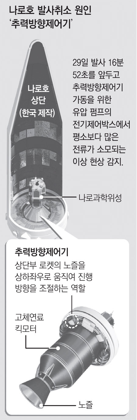 조 단장은 29일 “추력방향제어기를 조절하는 전기모터의 구동펌프가 고장 난 것으로 보인다”면서 “발사를 앞두고 점검하는 과정에서 이 부분에 수백 mA(밀리암페어)에 이르는 과전류가 흐르는 것이 감지됐다”고 밝혔다. 구동펌프가 정상적으로 작동하지 않으면 노즐이 제어가 안 된다. 결국 나로호 상단은 방향을 잃고 나로과학위성을 목표 궤도에 데려다 주지 못하게 된다. 발사 실패로 이어지는 것이다.