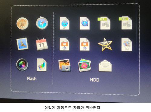 같은 애플리케이션 이더라도 자주 사용하는 실행 파일이 플래시 메모리 공간으로 나뉠 수도 있으며, 사진이나 동영상 등 주로 편집하고 작업하는 콘텐츠가 플래시 메모리 공간으로 나뉠 수도 있다. 나뉘는 기준은 사용 빈도 수다. 맥 OS X는 무조건 플래시 메모리 공간에 위치한다. 예를 들어, 사용자가 아이포토, 아이무비를 자주 사용하면 자동으로 해당 애플리케이션이 플래시 메모리 공간으로 이동한다.